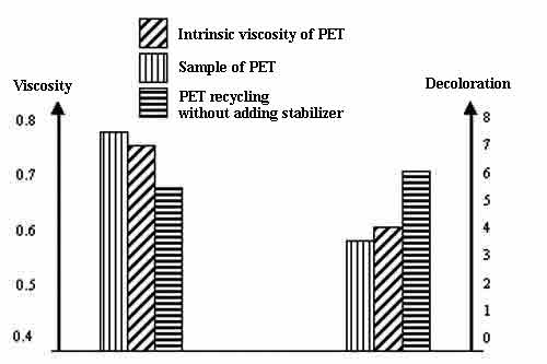 Pet recycling is the result of decrease of molecular weight of the product due to hydrolysis, thermal disintegration resultant from the temperature differences and drop in intrinsic viscocity. Intrinsic viscosity for pure PET (IV) is 0,80 dl/g for used PET it is 0,68-0,72 dl/g. During the recycling, the materials having comparatively high IV value usually suffer and drop in values. For instance raw materials with instrinsic viscosity IV =1.05 will have IV= 0.07 dl/g following the recycling Initial IV 0.5 will be 0.05 after recycling